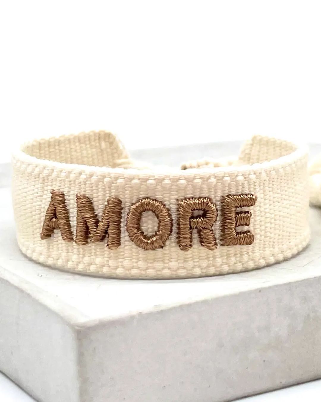 Das AMORE Statement Armband vereint Stil, Leichtigkeit und Bedeutung in einem Accessoire. Es ist gewebt und fein bestickt, angenehm weich auf der Haut und wird mit seinem lässigen Design schnell zum täglichen Lieblingsstück.