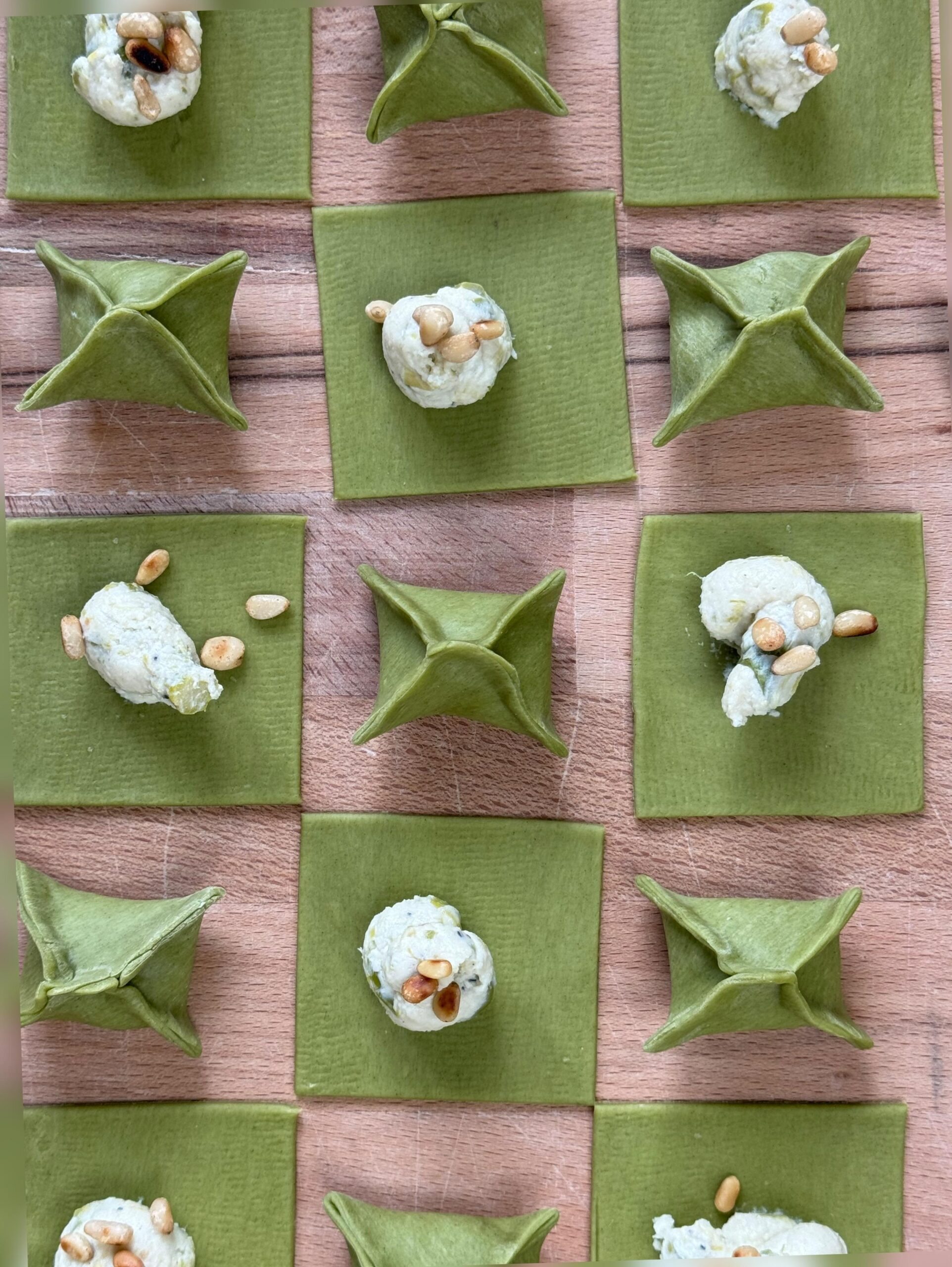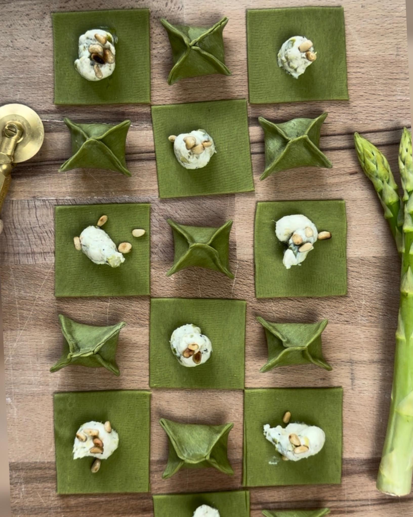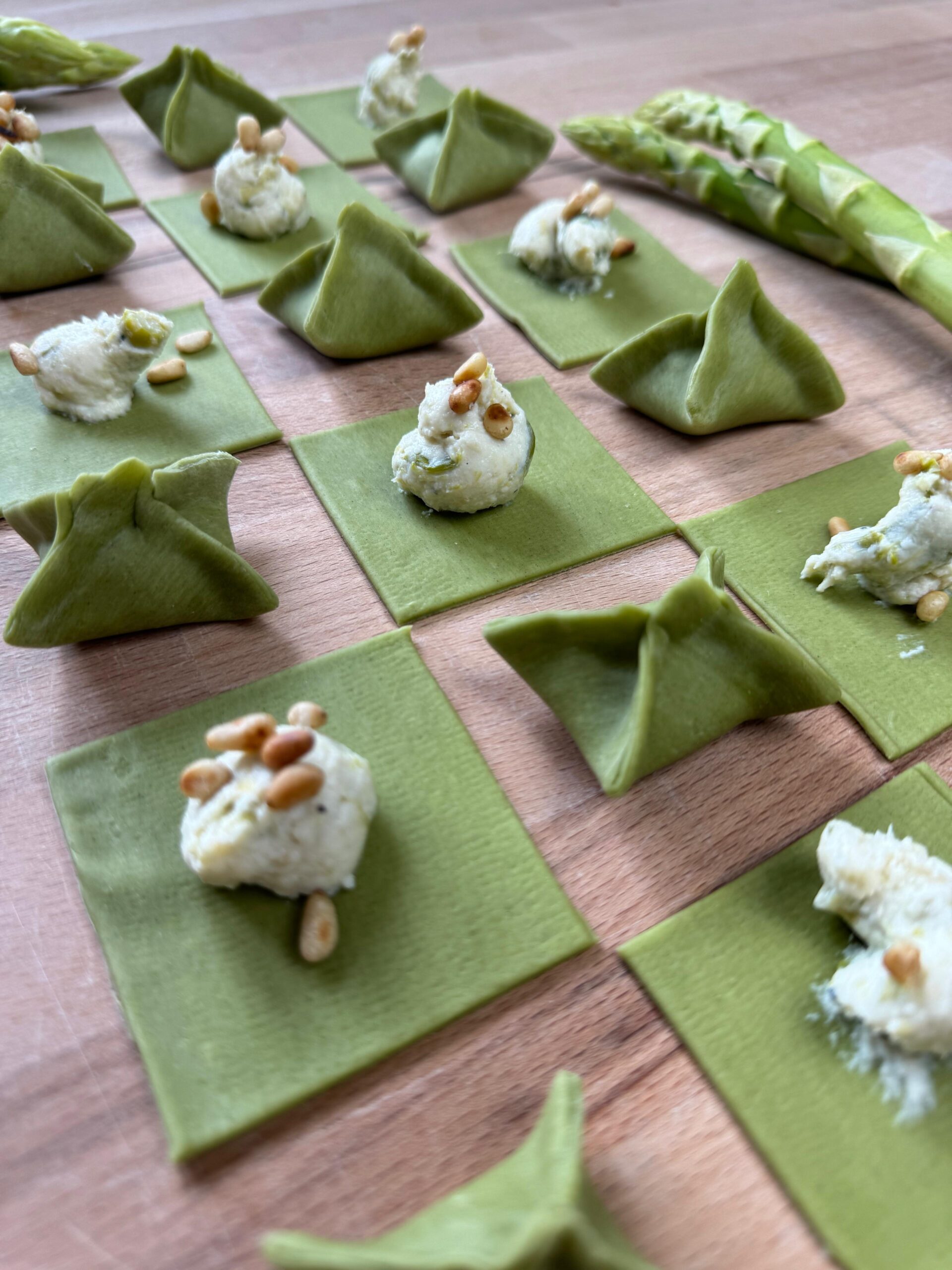 Fagottini der Raviola Manufaktur sind fein gefüllte Pastataschen mit zartem grünem Spargel und aromatisch gerösteten Pinienkernen. Die Kombination sorgt für ein frisches, leicht nussiges Geschmacksprofil mit feiner Textur. Ein hochwertiges Pastaerlebnis, das mediterrane Leichtigkeit und handwerkliche Qualität vereint.