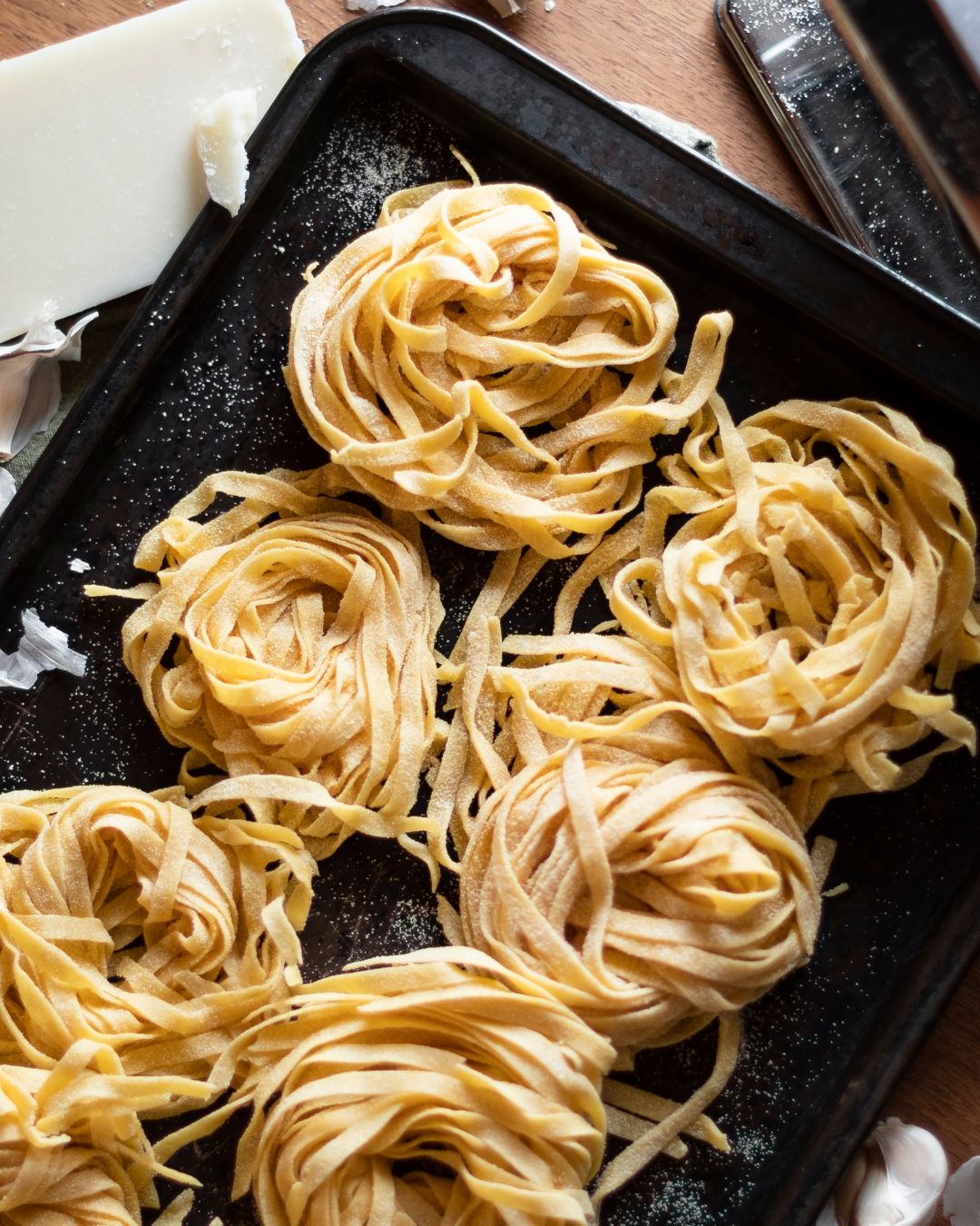 Pro Person rechnet man etwa 80 – 100g als Vorspeise oder zwischen 100 – 150g als Hauptgericht. Frische Pasta sollte stets gekühlt gelagert und möglichst am Tag des Kaufs genossen oder direkt eingefroren werden. Für das Kochen gilt: Bei frischer Pasta geht’s etwas schneller! Bring reichlich Salzwasser zum Kochen – es darf leicht sprudelnd sein, aber nicht zu stark wallen. Gib die Nudeln vorsichtig ins Wasser und rühre sie gleich nach dem Einlegen sanft um, damit sie nicht zusammenkleben. Die Kochzeit beträgt je nach Dicke nur etwa 2-3 Minuten. Wenn die Pasta al dente ist, kannst du sie direkt mit einer Zange aus dem Topf nehmen und in die vorbereitete Sauce geben.