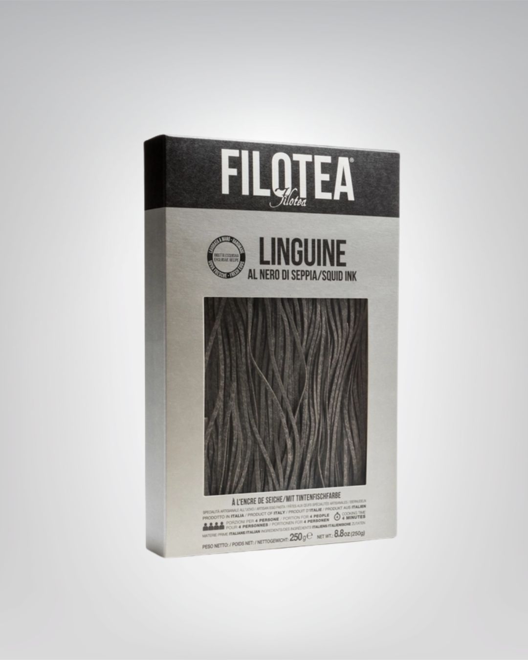 Diese Linguine werden nach traditioneller Filotea-Methode gefertigt und mit hochwertiger Tintenfischtinte verfeinert. Die Basis bilden ausgewählte Zutaten wie Hartweizengrieß, Mehl Typ 00 und frische Eier, verarbeitet nach handwerklichen Standards.