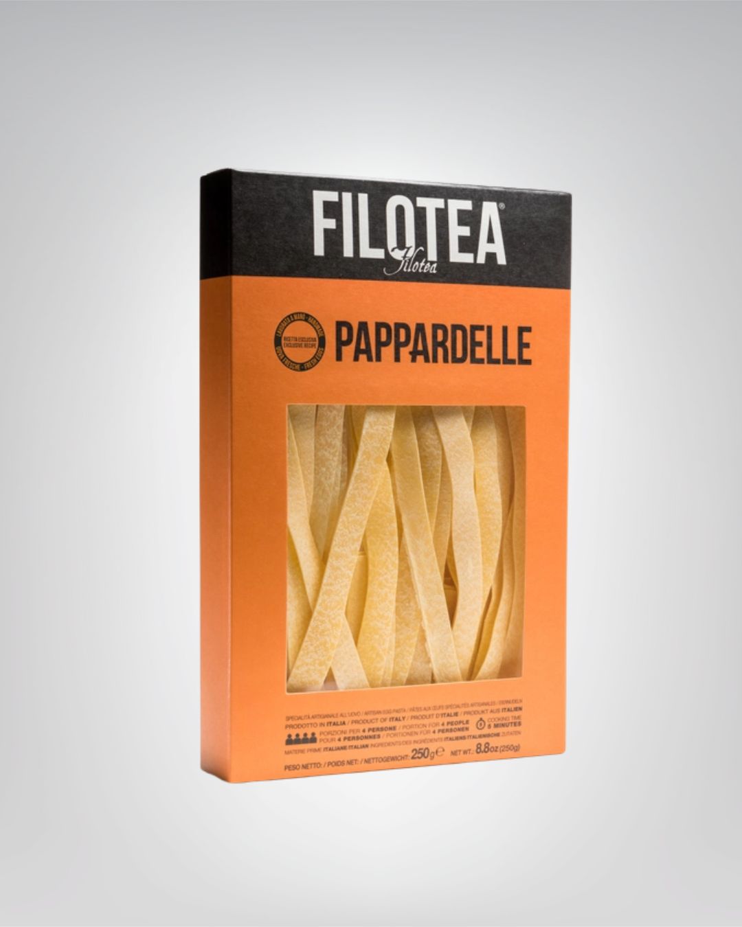 Die Pappardelle von Filotea sind breite Bandnudeln, die nach handwerklicher Artisan-Methode gefertigt werden. Hochwertiger Eiernudelteig und schonende Verarbeitung sorgen für eine kräftige, dennoch ausgewogene Pasta mit hervorragender Saucenbindung.