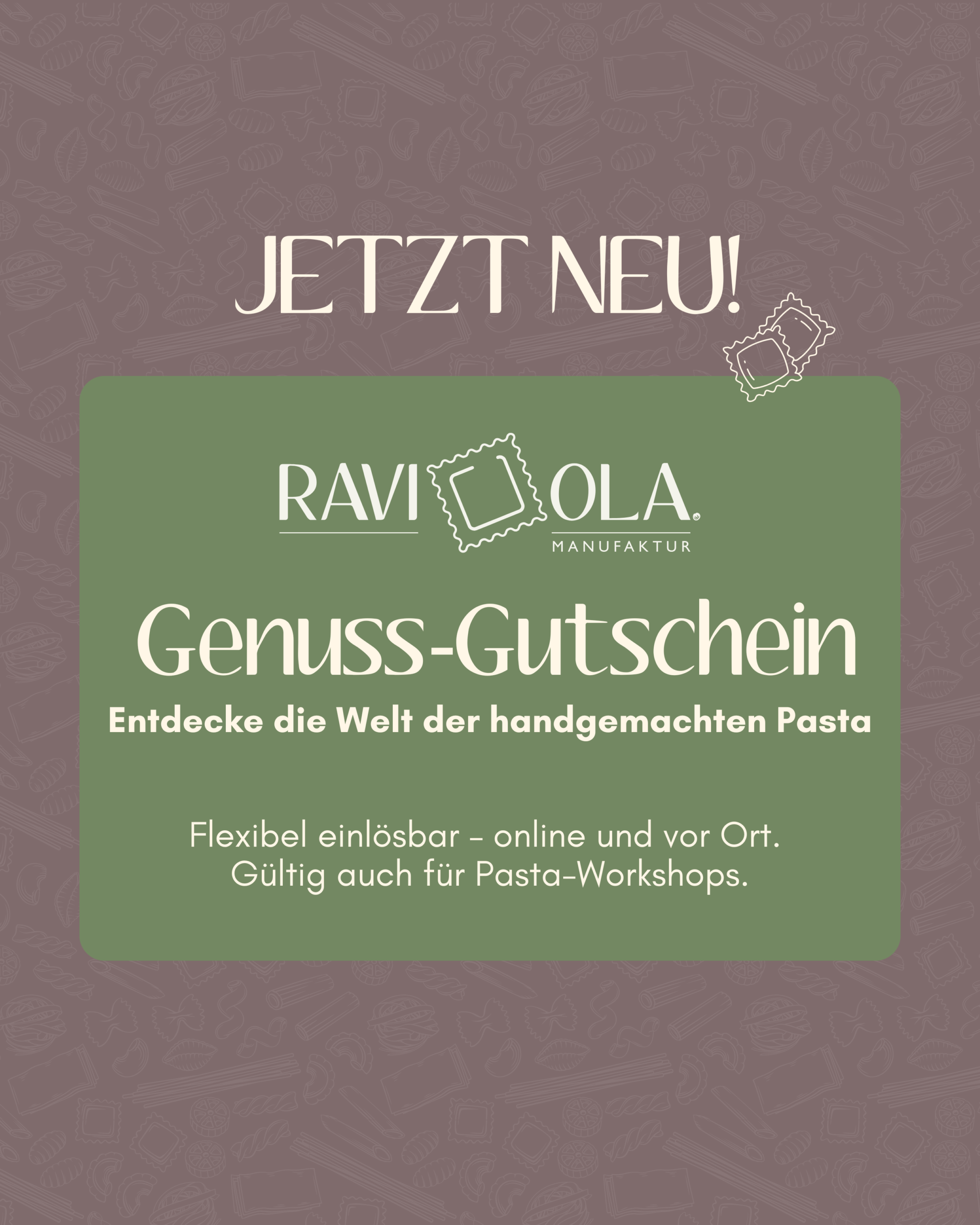 Ein Geschenk, das immer passt: Mit dem Raviola-Manufaktur-Geschenkgutschein schenkst du handgemachten Genuss, ehrliches Handwerk und besondere Geschmacksmomente. Flexibel einlösbar und ideal für alle, die gute Küche zu schätzen wissen.