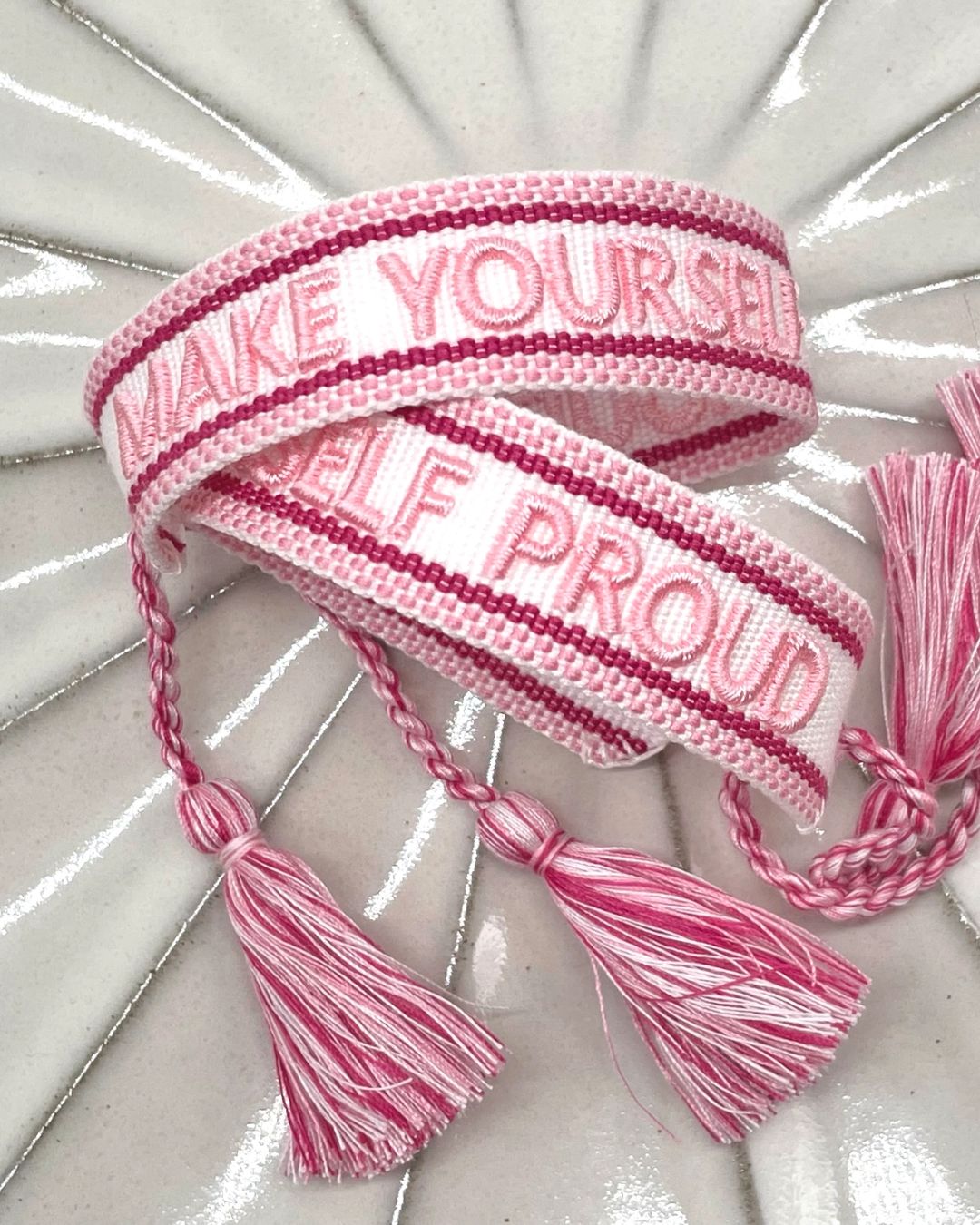 Das Make Yourself Proud Statement Armband vereint Stil, Leichtigkeit und Bedeutung in einem Accessoire. Es ist gewebt und fein bestickt, angenehm weich auf der Haut und wird mit seinem lässigen Design schnell zum täglichen Lieblingsstück.