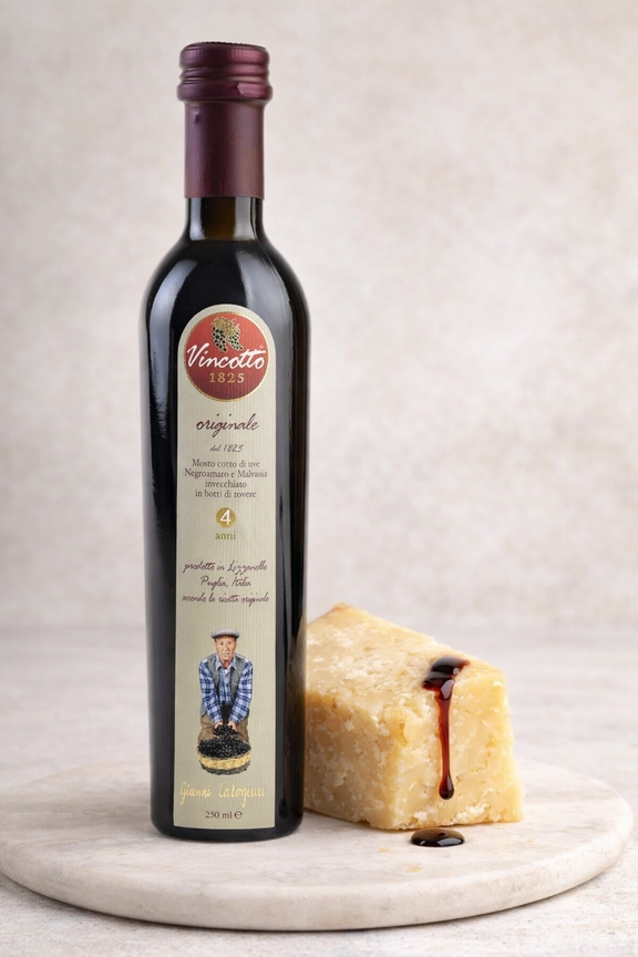 Der Originale Vincotto ist ein edler, natürlich gereifter Balsamico mit ausgewogener Süße und feiner Säure. Hergestellt aus gekochtem Traubenmost, Weinessig und Obst, reift er über sechs Jahre in Eichenfässern und entfaltet dabei seine charakteristische, samtige Tiefe und harmonische Aromatik.