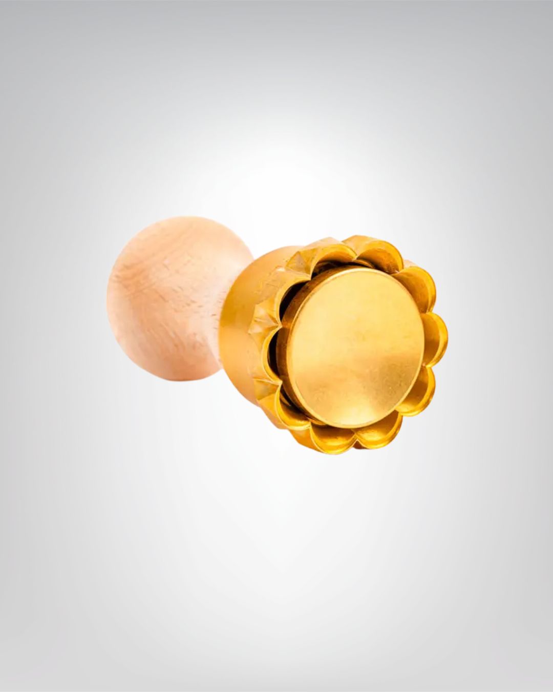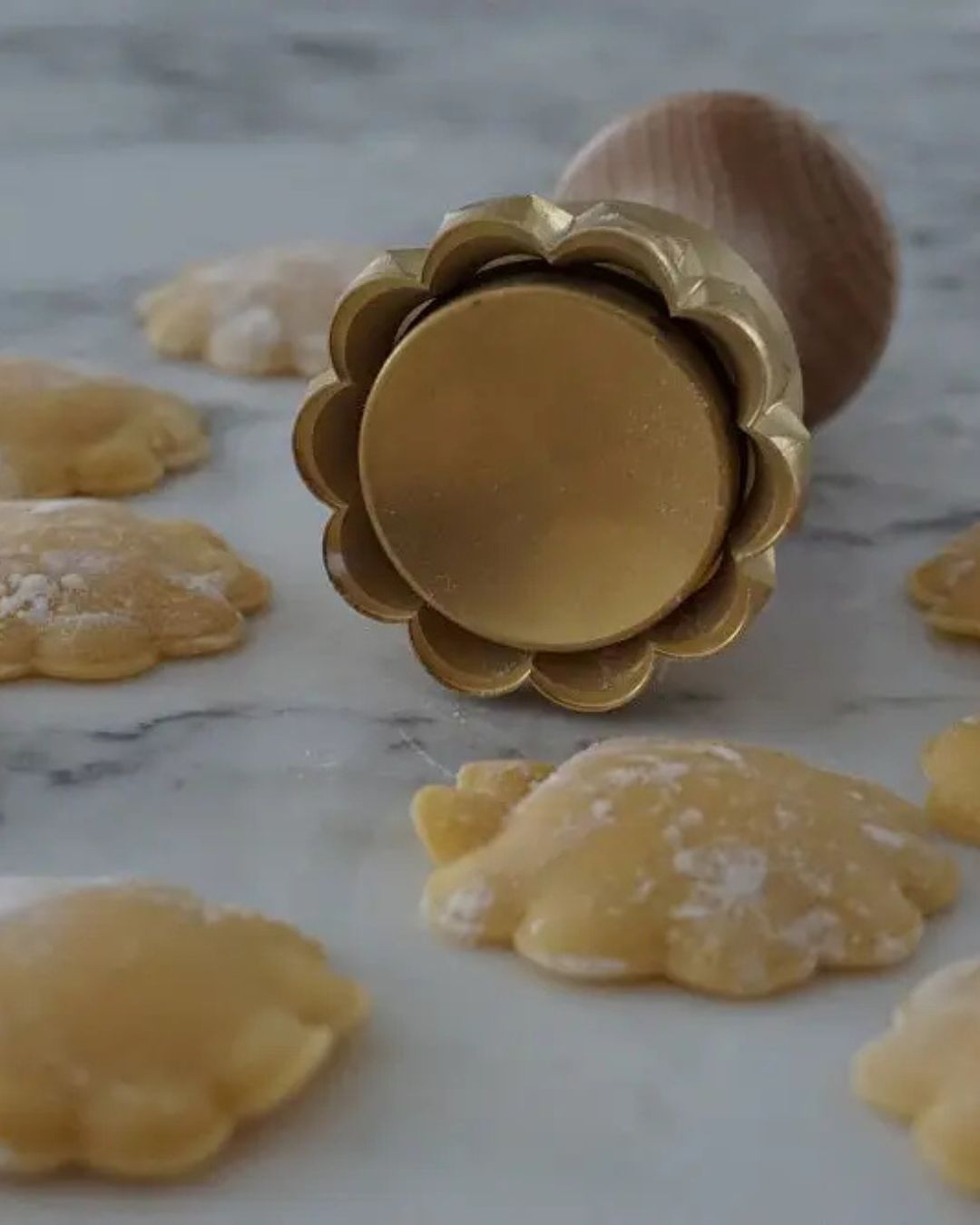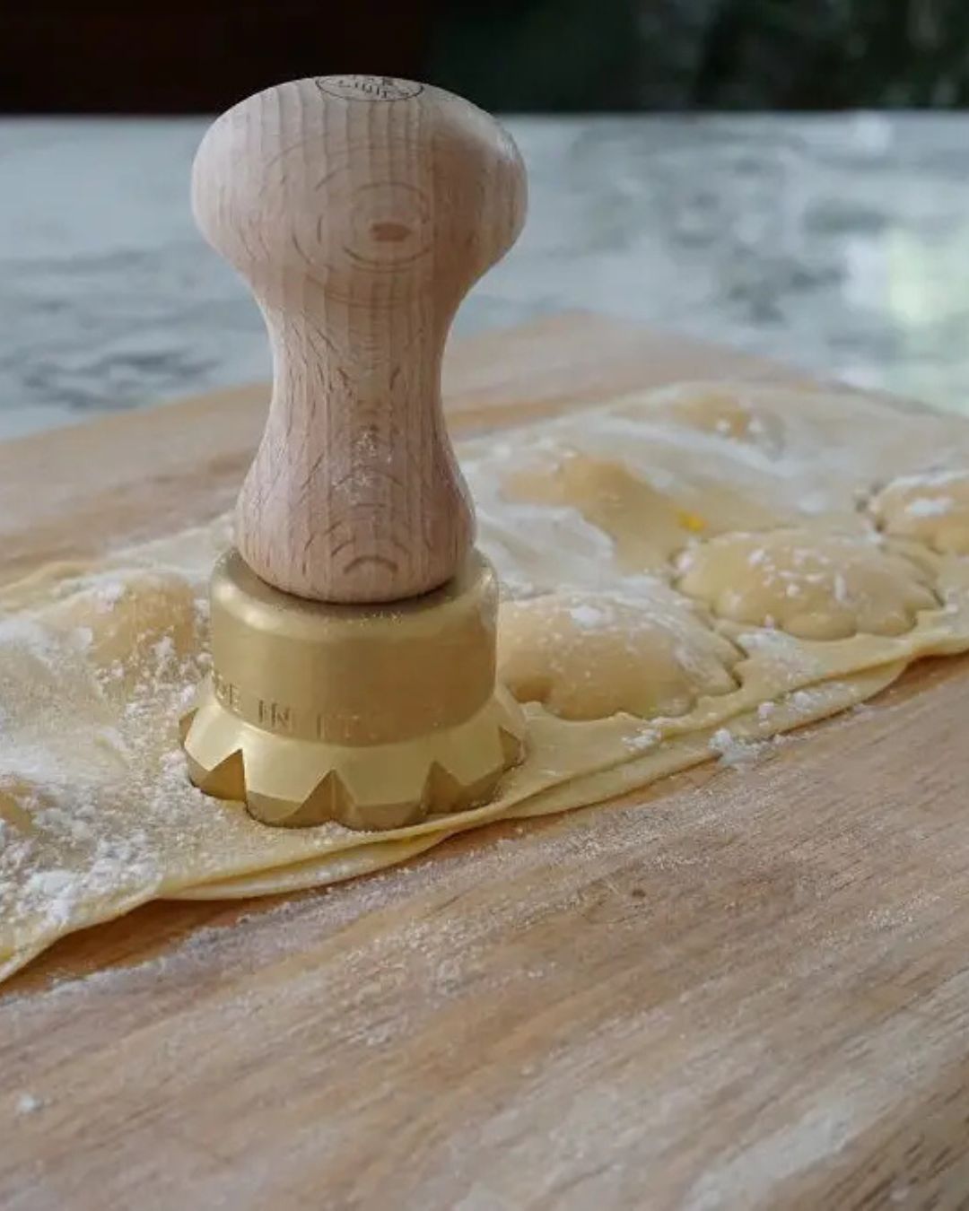 Handgefertigter Blumenstempel aus massivem Messing und Naturholz für perfekt verschlossene, gleichmäßig geschnittene Ravioli. Der präzise Schnitt verhindert das Aufplatzen beim Kochen und spart Zeit sowie Frust gegenüber günstigen Werkzeugen. Ideal für frische Pasta zuhause oder in der Profi-Küche. Langlebiges Design, das Generationen überdauert – hochwertig gefertigt in Italien.